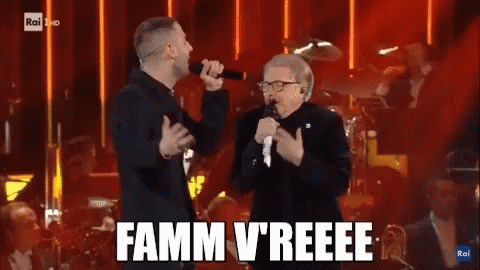 Nino D'Angelo performs 'Famm V'reee' on stage at Sanremo, singing passionately with another artist.