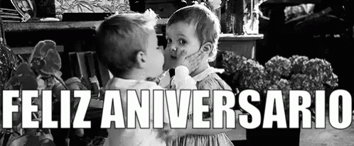 Two young children share a sweet kiss in a black and white photo, with 'Happy Anniversary' text.