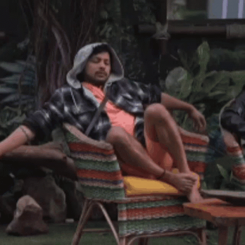 Nishant Bhat from Bigg Boss 15 enjoys a lazy morning stretch while relaxing in a colorful chair outdoors.