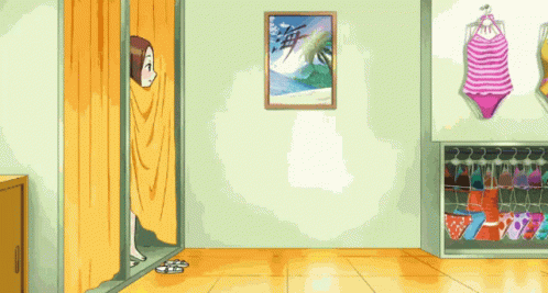 Nishikata attempts to hide a yellow swimsuit from Takagi in a dressing room, showing shyness.