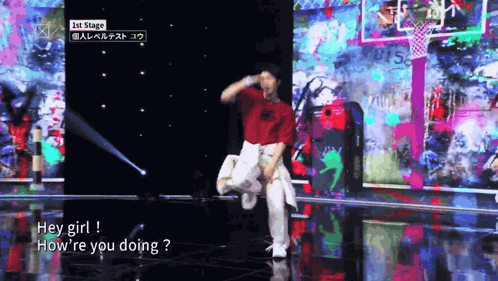 Yuu from Nizi Project performs on stage, asking 'Hey girl! How're you doing?' during his 1st Stage.