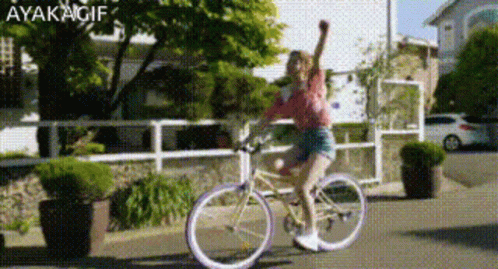 Niziu Ayaka rides a bike down a street with her arm in the air.