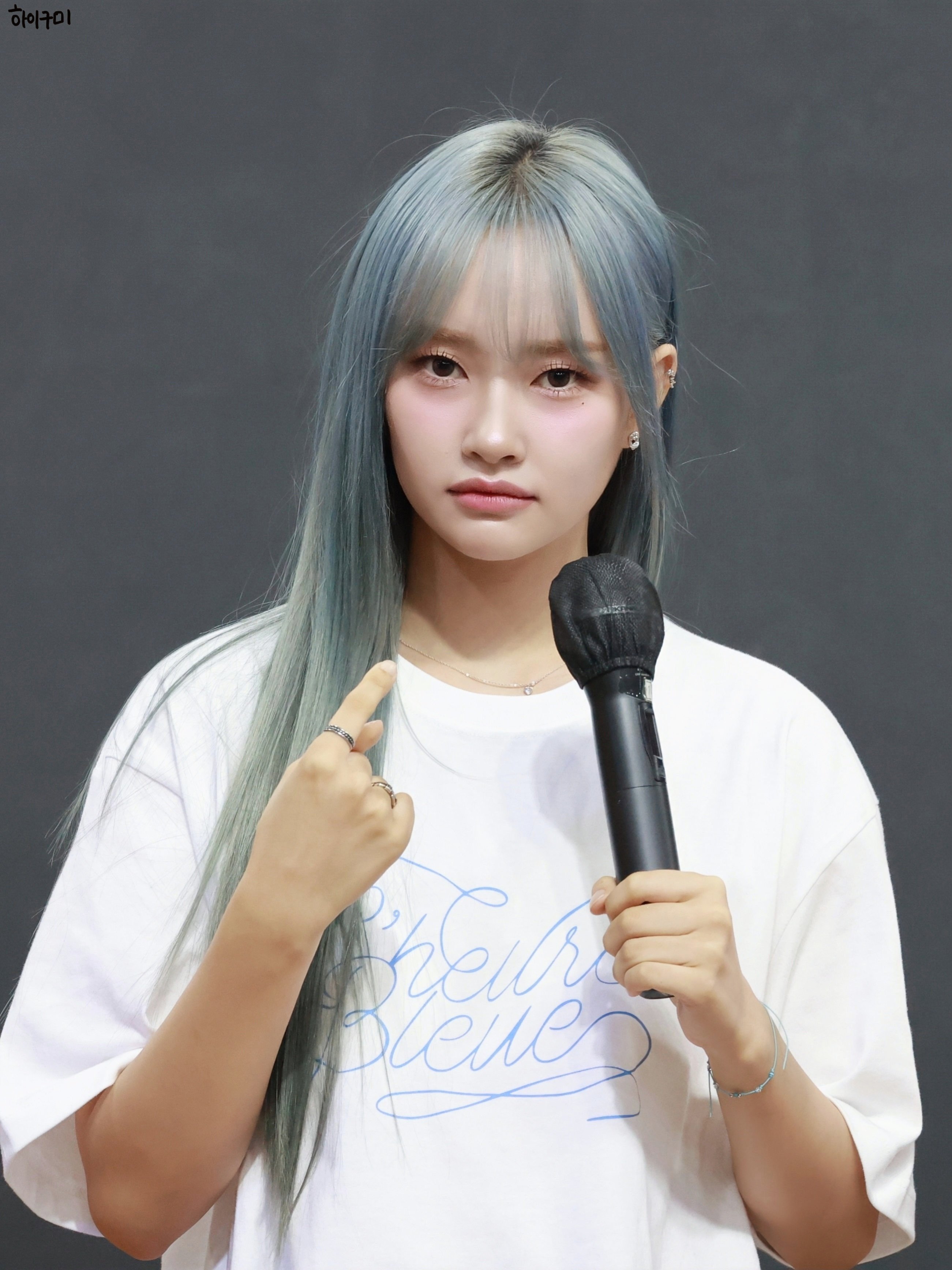 NiziU members Riku and Ayaka share a playful hug, making funny faces in their white hoodies.