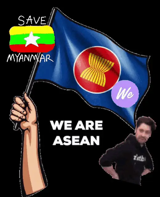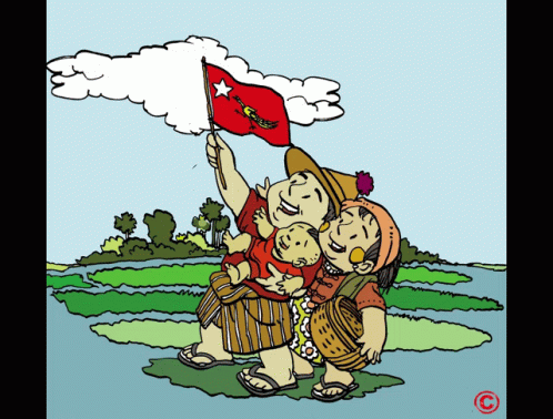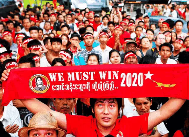 Family with NLD flag, supporting Aung San Suu Kyi and the 2020 Myanmar election.