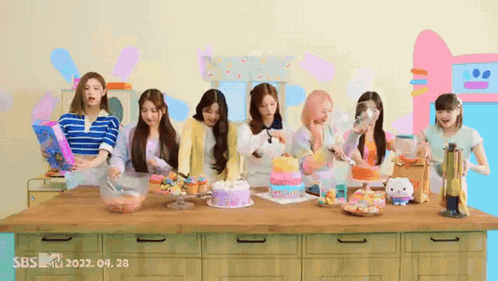 a group of girls standing around a table with cakes and cupcakes .