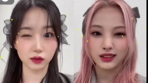 Nmixx members Haewon and Jinni show playful expressions; Haewon winks while Jinni makes a confused eye twitch.