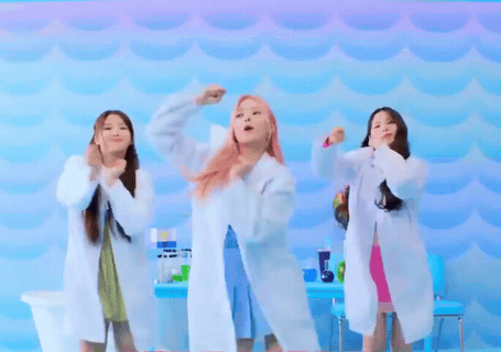 Nmixx members Jini, Jiwoo, and Kyujin perform the 'Hey Gabby' dance in lab coats.