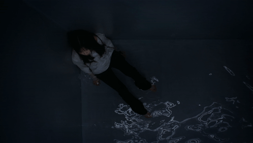 Nmixx's Kyujin lies in a dark, water-filled room, reflecting the 'Aurora' story film concept.