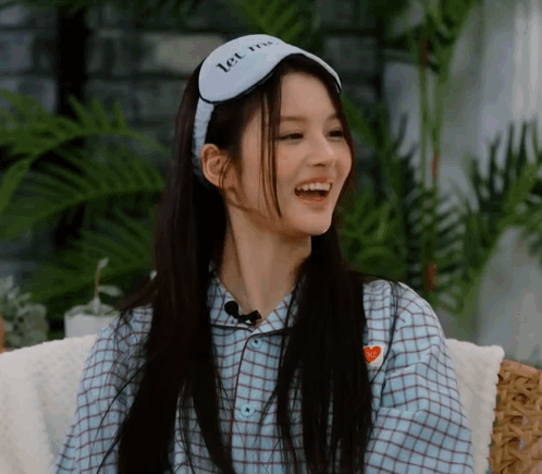 NMIXX member Sullyoon laughs joyfully while wearing a sleep mask and checkered pajamas.