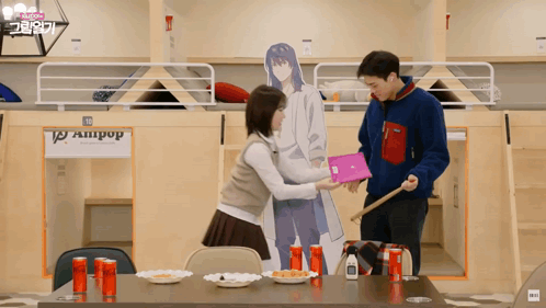 a man and a woman are standing in front of a sign that says ampop