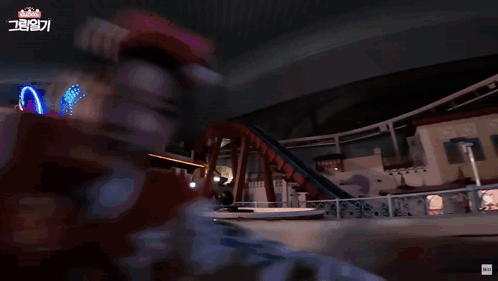 NMIXX members Bae, Haewon, Jiwoo, Kyujin, Lily, and Sullyoon having dizzy fun on a spinning basket ride at Lotte World.