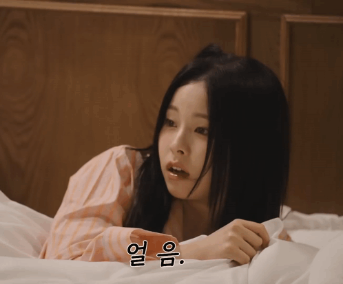 Nmixx's Kyujin looks startled in bed, wearing pajamas, with a Korean caption "얼음." (Freeze.).