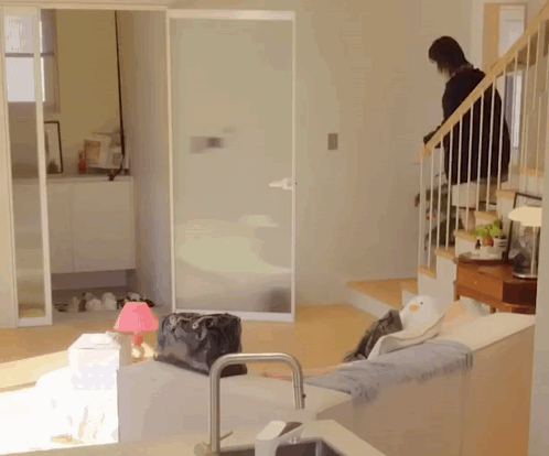 Nmixx Haewon jumps on the couch while Sullyoon descends the stairs in a cozy living room.