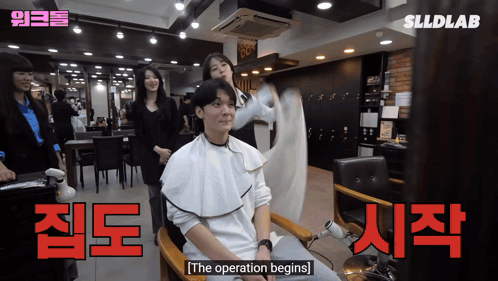 Nmixx's Haewon comically prepares a client for a haircut with an exaggerated cape flourish in a hair salon.