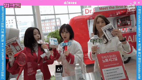Nmixx members Haewon and Kyujin promote a scalp treatment product during their Workdol appearance.