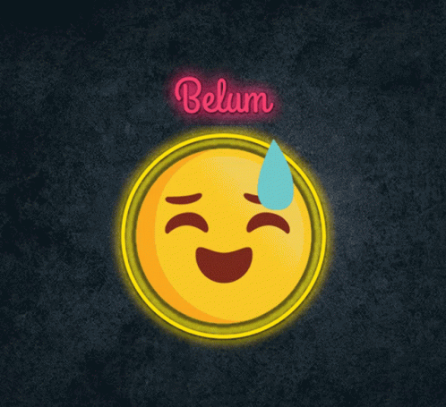 A glowing neon sign features a shy emoji and the word "Belum" (Not yet) in a vibrant pink script.