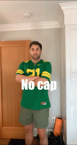 Man in a green jersey with number 71 on it, arms crossed, confidently says 'No Cap'.