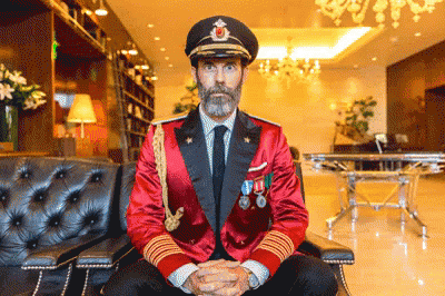 Captain Obvious, in a red uniform and hat, shakes his head with a 'no' expression in a hotel lobby.