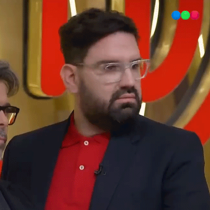 Damián Betular, wearing glasses and a red shirt, shakes his head in disapproval on MasterChef Argentina.