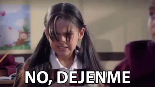 A little girl in a school uniform cries out 'No, dejenme' in a classroom, appearing distressed.