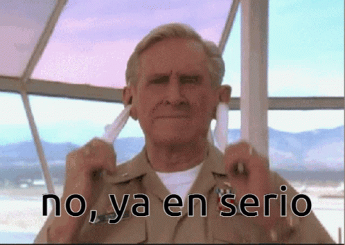 A man in a military uniform puts in earplugs with the Spanish caption 'no, ya en serio' (no, seriously now).