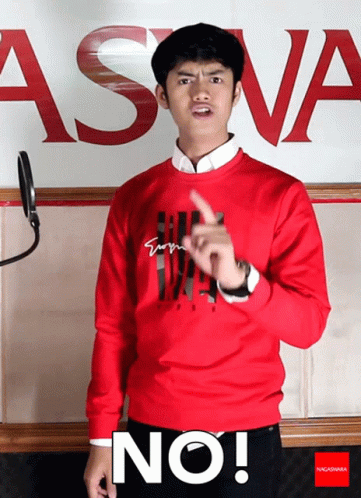 A young man in a red sweater emphatically says 'No!' with a pointed finger in a studio setting.