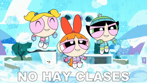 Bombon, Bellota, and Burbuja (Las Chicas Superpoderosas) celebrate a snowy day with 'No Hay Clases' (No School).
