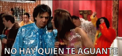 Ludovico Peluche reacts to a woman at a party, with the phrase 'No Hay Quien Te Aguante' on screen.