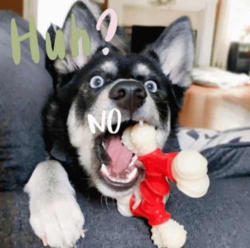 A surprised husky dog with wide eyes and an open mouth reacts to something, with 'Huh?' and 'NOOO' captions.