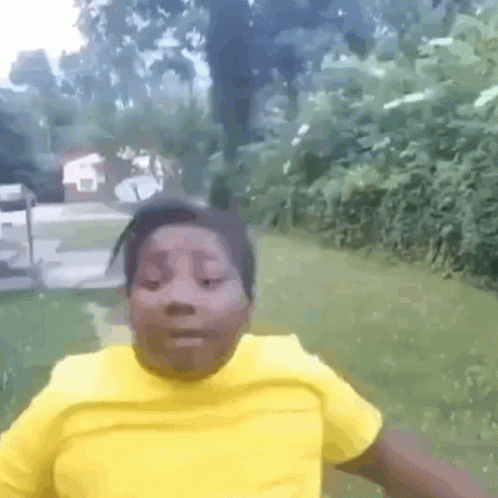 Koavminaj, a young boy in a yellow shirt, stands in the grass and says 'no' with a determined expression.