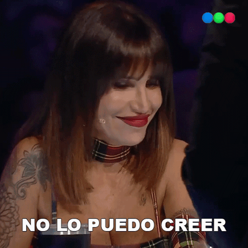 Flor Peña reacts with 'No Lo Puedo Creer' (I Can't Believe It) on Got Talent Argentina, smiling in a plaid outfit.