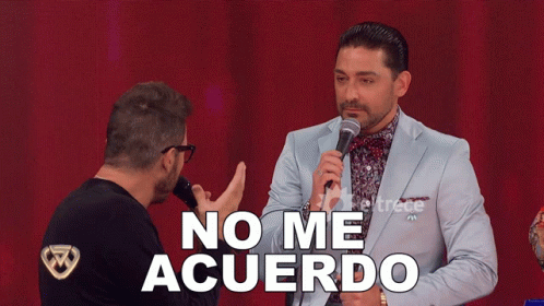 A man speaking into a microphone on the Argentine TV show Showmatch La Academia, with 'No Me Acuerdo' displayed.