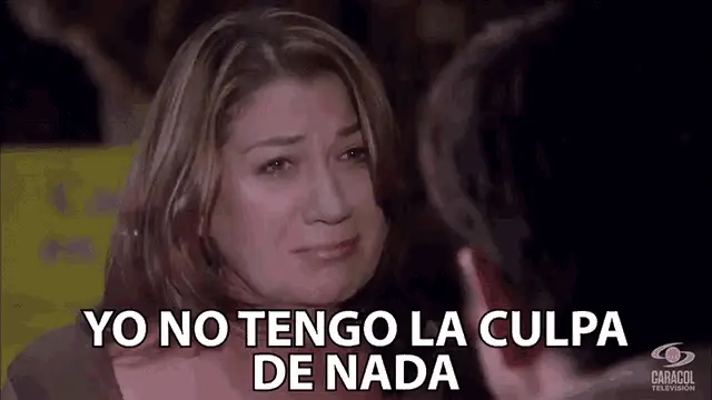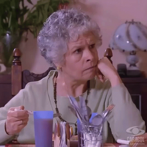Maria Margarita Giraldo as Dona Ruca, looking skeptical at a table with a drink and cutlery.