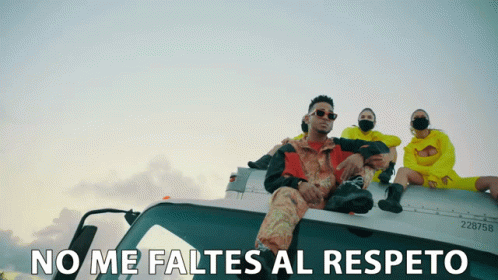 Ozuna and others on a vehicle with the text 'No Me Faltes Al Respeto' displayed.