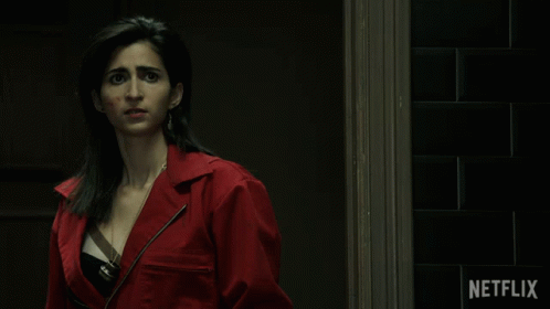 Alba Flores as Nairobi from La Casa de Papel, looking displeased in her red jumpsuit, with the Netflix logo visible.