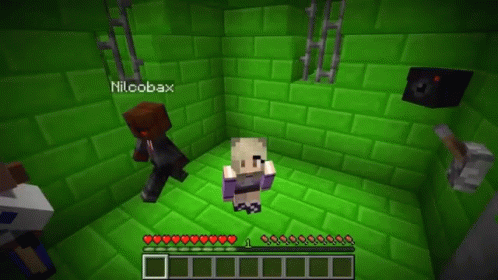 Lyna's Minecraft gameplay featuring Niloobax in a green cell, with a chibi character expressing "I don't like this."