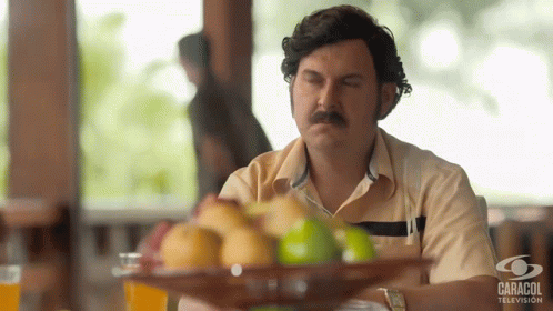 Pablo Escobar (Andres Parra) shaking his head in disapproval, from Caracol Television series.
