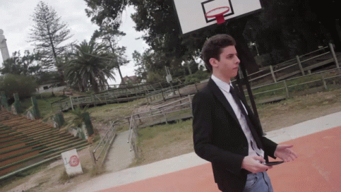 Federico Friedmann (Fedefw) in a suit, throwing a phone on a basketball court.
