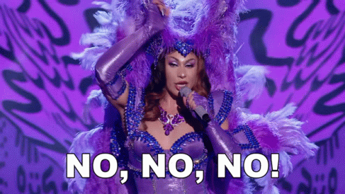 Grag Queen passionately sings 'NO, NO, NO!' on stage, adorned in a vibrant purple feathered costume.
