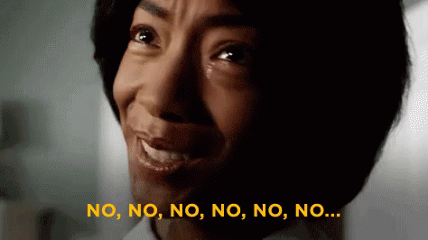 A person with a concerned yet slightly smiling expression repeatedly says 'No'.
