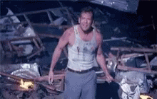 Bruce Willis, in a destroyed setting, utters his iconic line 'No Problem' with a shrug.