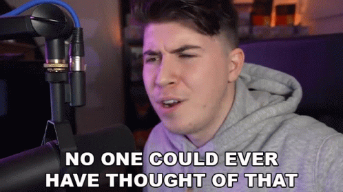 A man in a grey hoodie with a microphone, displaying the caption 'No One Could Ever Have Thought Of That'.
