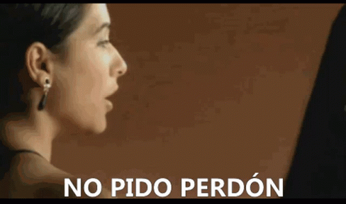 A woman looks at herself in a mirror with the text 'No Pido Perdón' displayed.