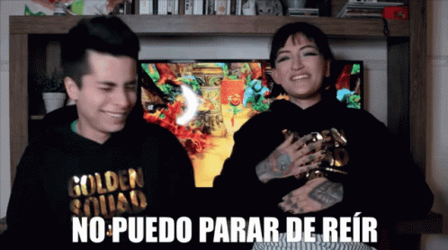 A man and a woman, possibly matugarces, laughing uncontrollably in front of a TV, unable to stop.