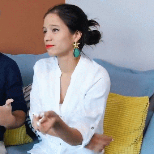 La Cooquette shrugging and expressing 'No Se' while sitting on a blue couch, wearing a white shirt and blue earrings.