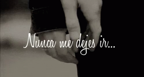 A tender moment captured as a couple holds hands, with the Spanish text 'Nunca me dejes ir...' (Never let me go...) overlaid.