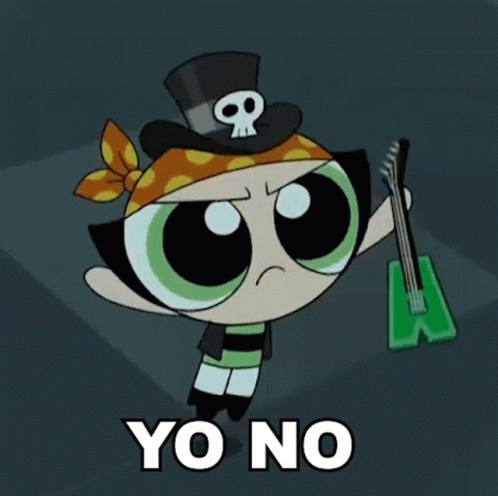 Bellota from Powerpuff Girls holds a guitar and exclaims 'No Tengo Dinero' in a rock-and-roll outfit.