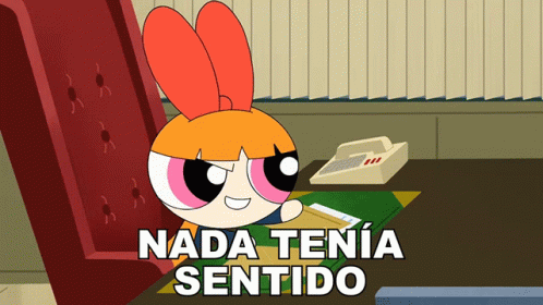 Blossom from The Powerpuff Girls sits at a desk with the Spanish caption 'Nada Tenía Sentido' (Nothing Made Sense).