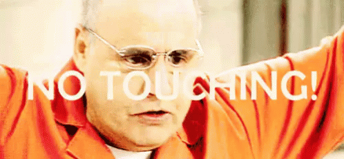 Jeffrey Tambor as Oscar Bluth emphatically warns 'No Touching!' while wearing an orange jumpsuit.