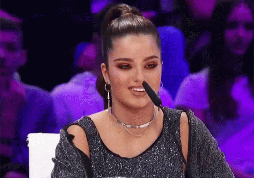 Israeli singer Noa Kirel smiling brightly while seated at a table with a microphone, likely during a talent show.